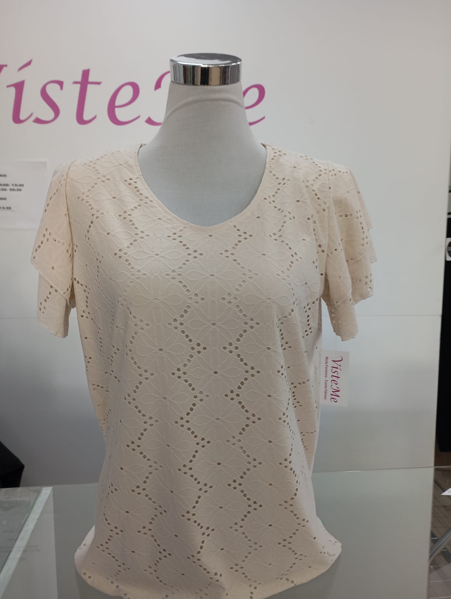 Blusa de manga corta calada en color beig.