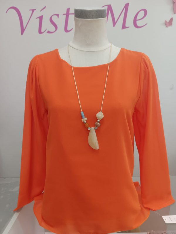 Blusa de gasa color naranja, lleva collar incluido, el tejido no es elástico.
