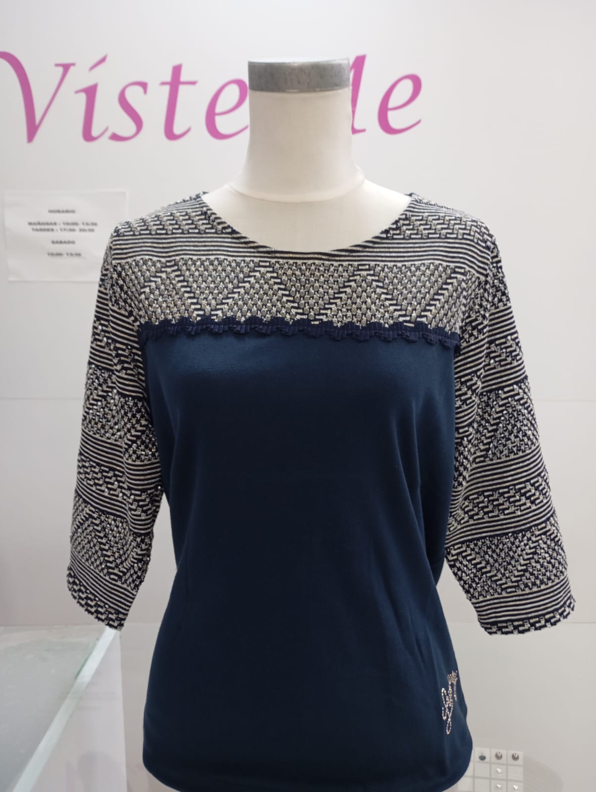 Camiseta de media manga con blonda en color azul marino, el tejido es elástico.