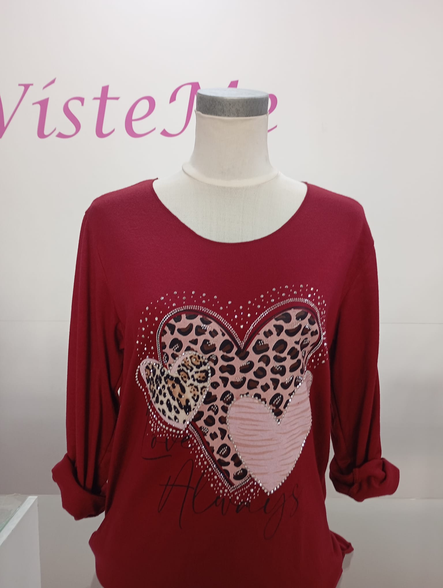 Camiseta de manga larga en color burdeos con dibujo de corazón.