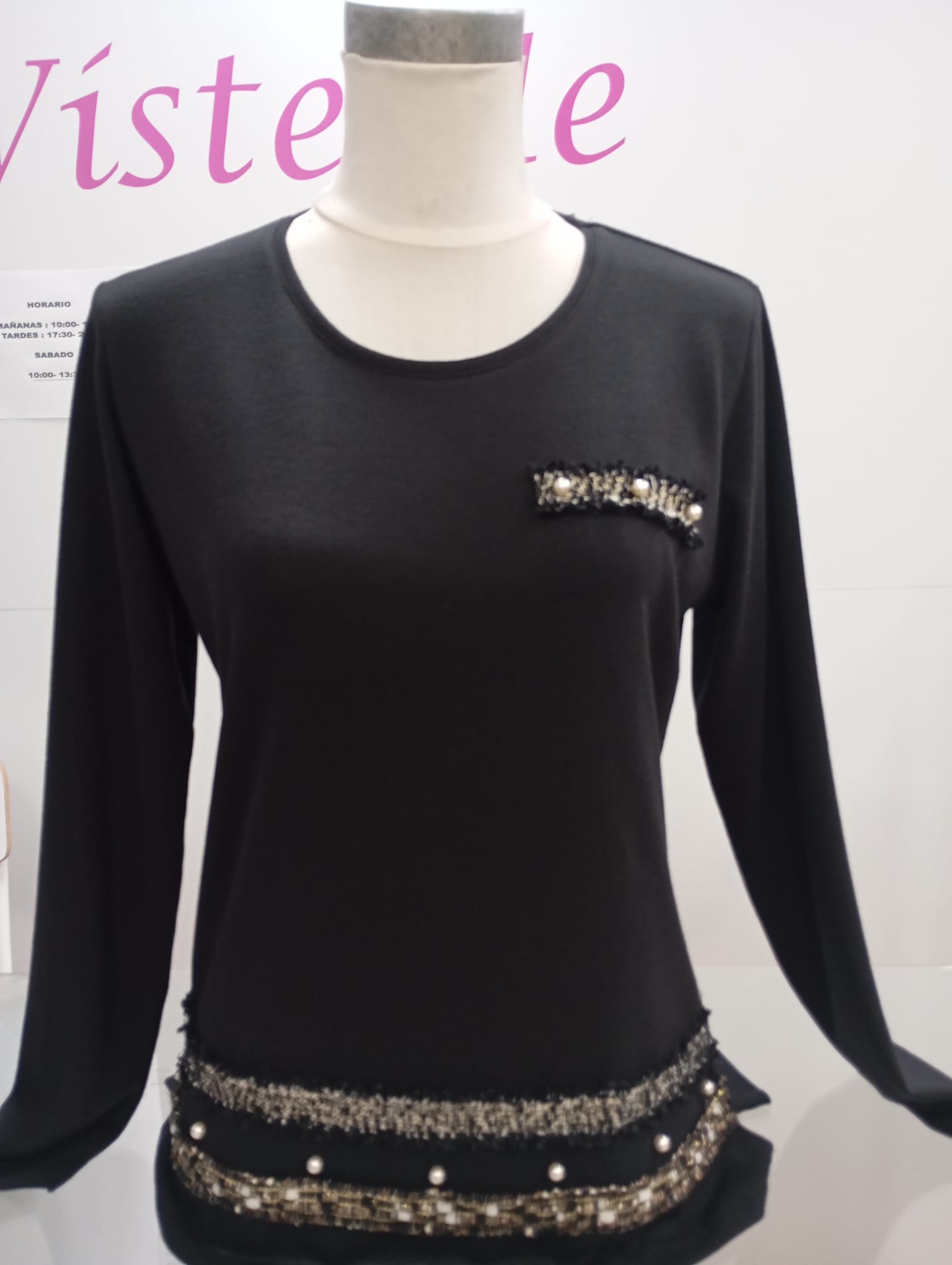 Camiseta negra de manga larga con adorno, el tejido es elástico.