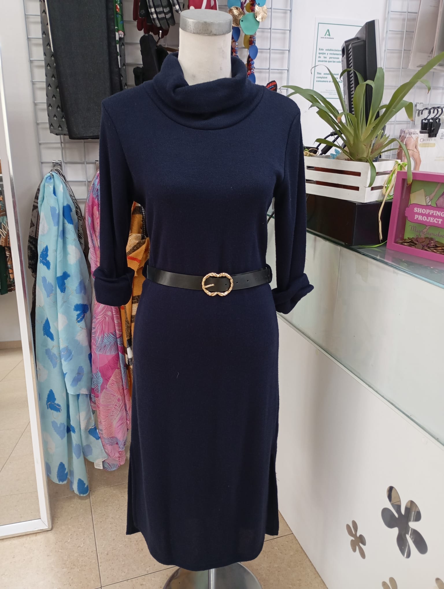 Vestido de punto en azul marino, lleva cinturón incluido.