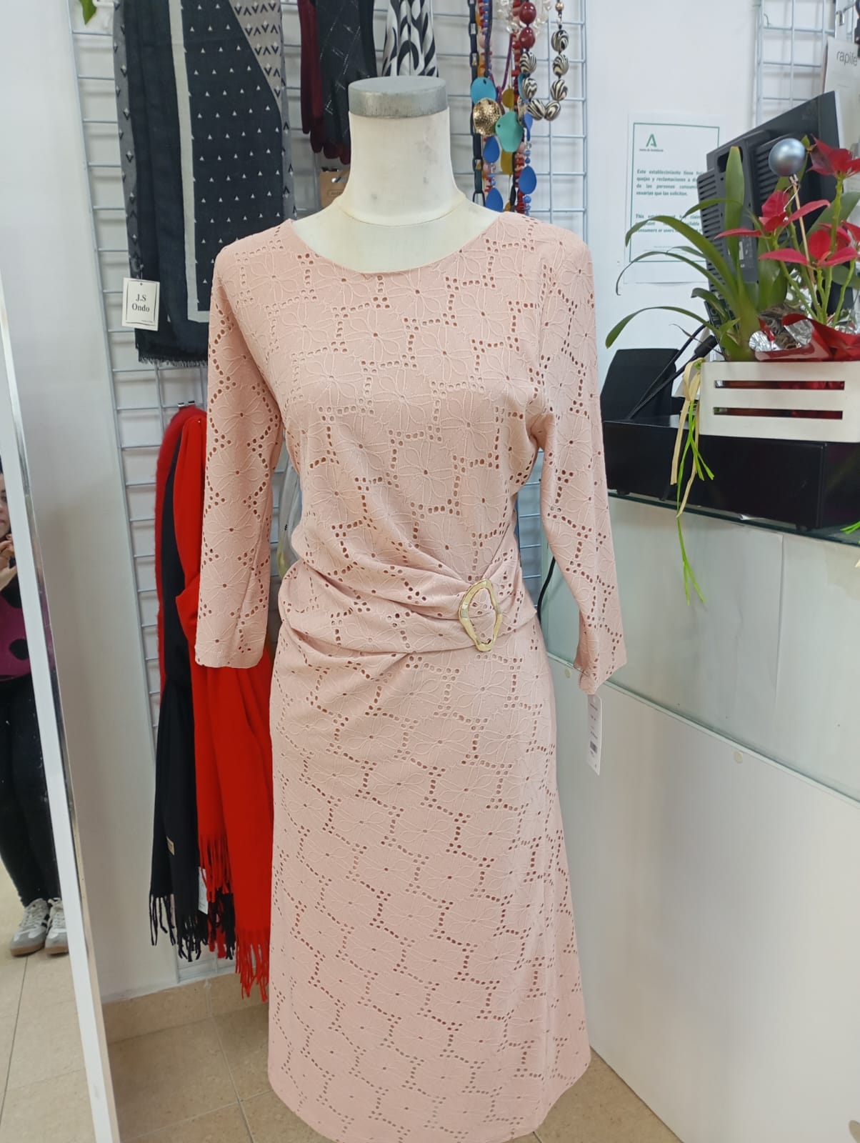 Vestido color rosa claro con blonda y nudo el en lateral, el tejido es elástico.