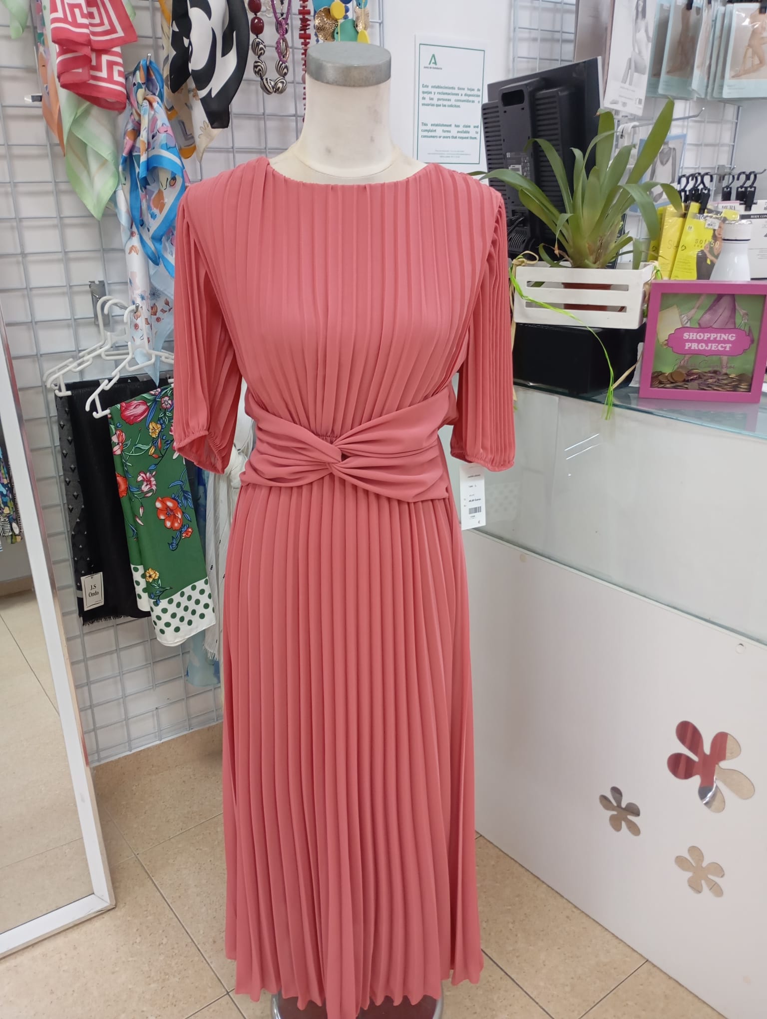 Vestido plisado coral de media manga, lleva goma en la cintura.